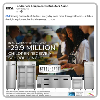 Social Media Ads Complimentary with our member packages, FEDA will share your company's content on our social media platforms to our audience of over 7,500 industry professionals. Posts highlight your brand, products and innovations, engaging a targeted audience of foodservice equipment leaders. |