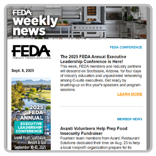FEDA Weekly News Advertising FEDA's weekly newsletter delivers the latest member and industry updates, including association priorities, personnel changes, events and new products. The newsletter reaches over 2,500 distributors, dealers, manufacturers and other foodservice equipment professionals each week, with an average of 1,400 opens and 1,600 clicks per issue. View FEDA Weekly News Opportunities