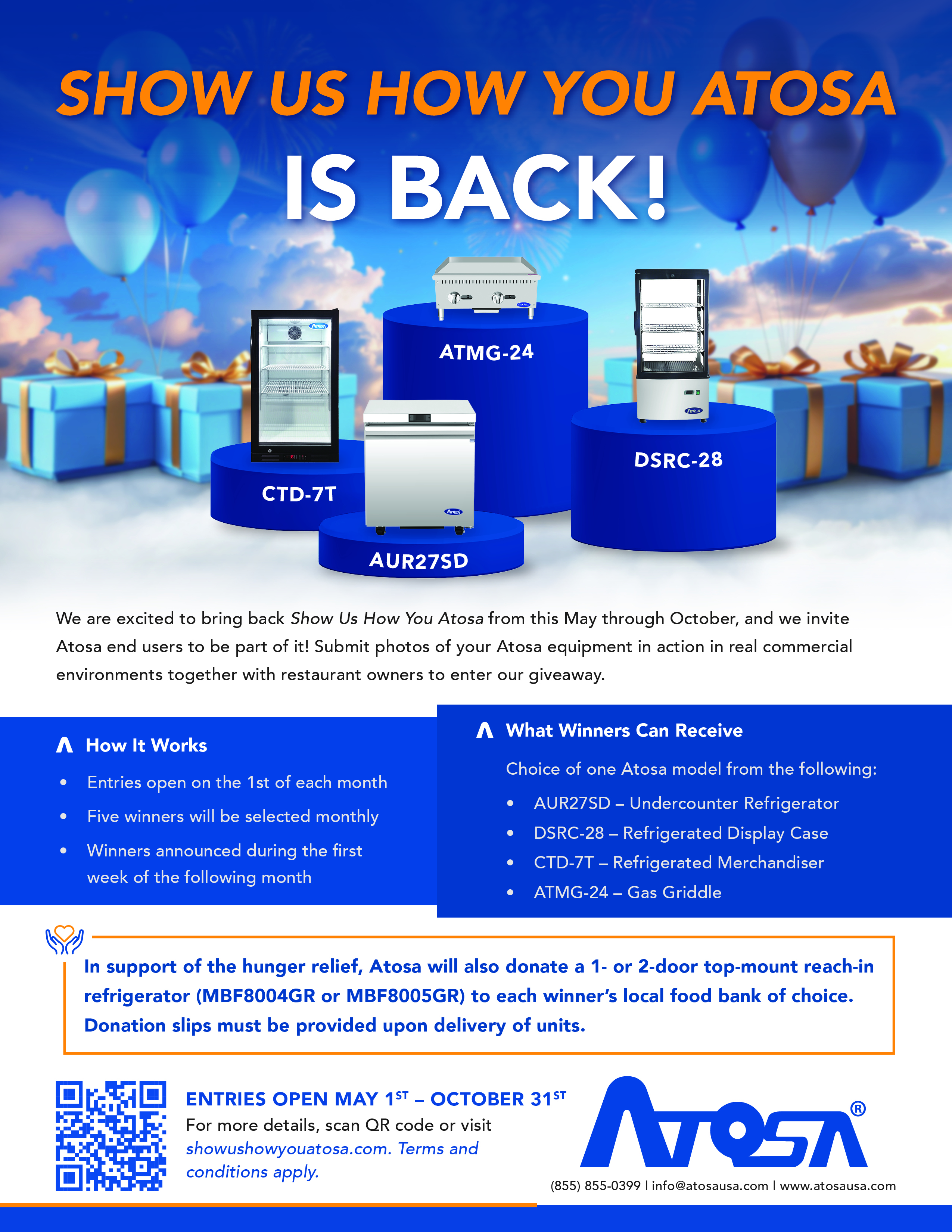 The program invites operators to submit photos of their Atosa equipment in action in real commercial kitchens. Foodservice equipment and supplies distributors are asked to encourage their customers to participate by submitting entries at showushowyouatosa.com. A flyer that can be shared with customers is available here. Each month, five winners will be selected and will receive their choice of select Atosa equipment. Winners will also be able to select a local food bank to receive an equipment donation.