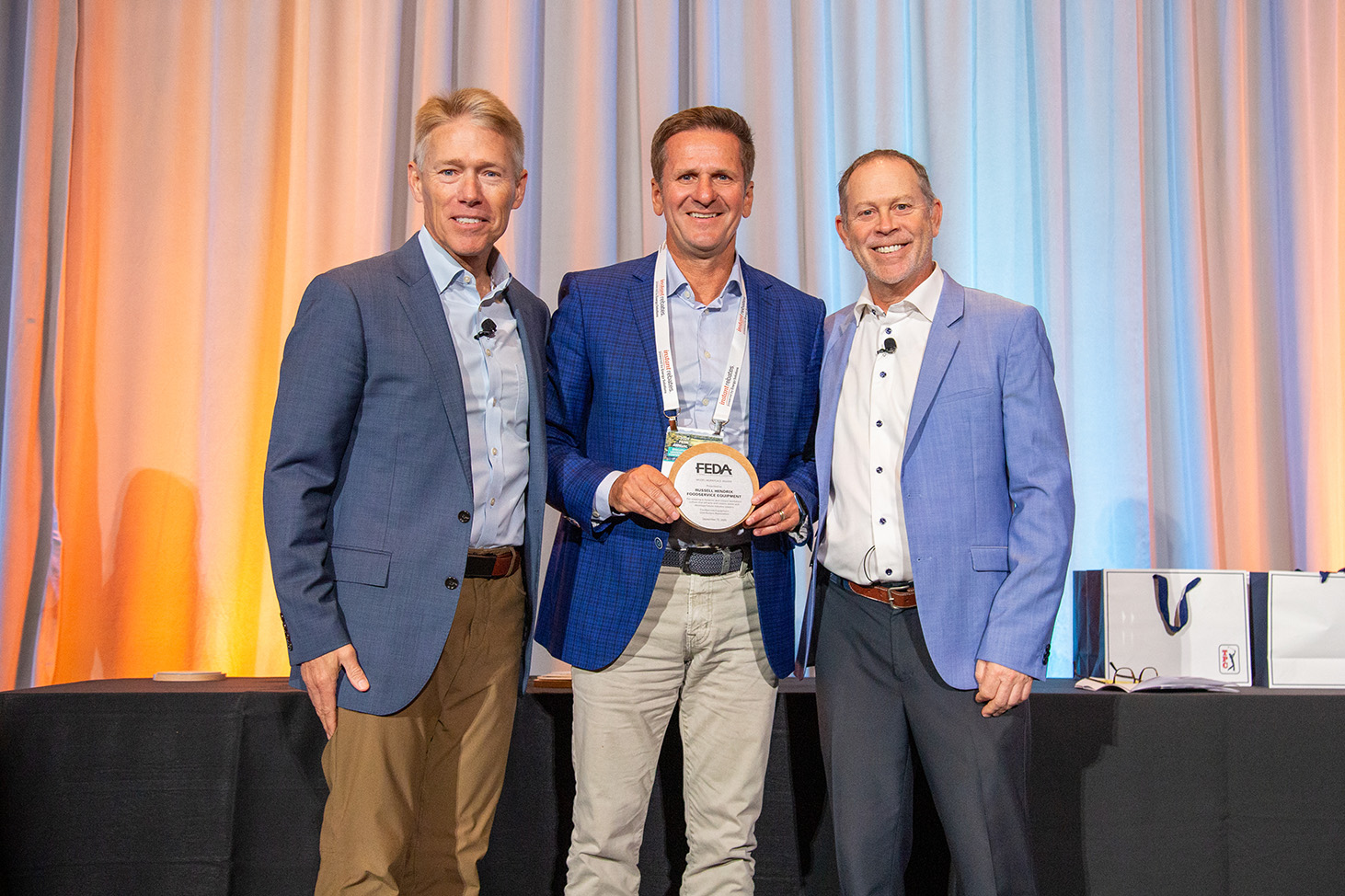 Stan Dabic, CEO of Russell Hendrix, poses with ITW’s Gary Simpson and FEDA Chairman Marc Tell, CEO of Sam Tell Companies, as he accepts the Model Workplace award at the FEDA Gold Awards Breakfast.