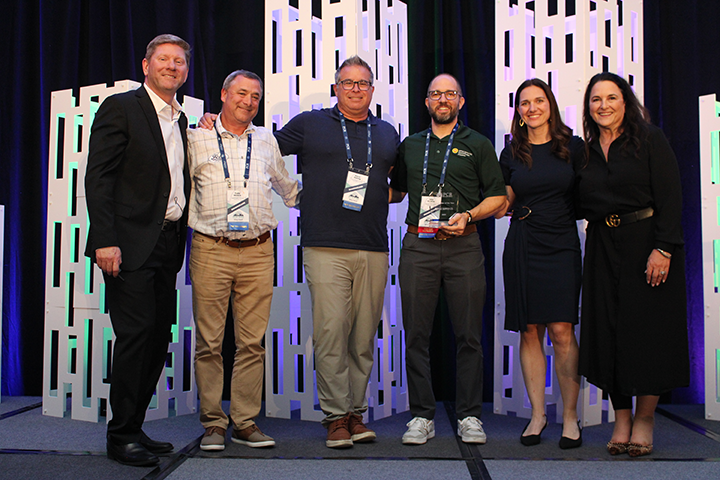 Greb Ebel of PCR, with Todd Minkin, Steve Meinig and Gary Thiakos of Zepole Supply Company, and Cara Schlarb and Cathy Ellickson of PCR. Zepole was named Dealer of the Year at PRIDE's recent conference.